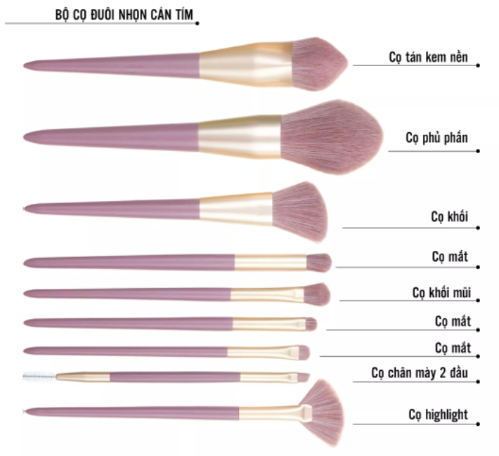 Đặc điểm: Tên sản phẩm: Bộ cọ trang điểm Chất liệu: lông bằng tơ lụa ; Cán gỗ Số lượng: 9 cọ trang điểm, đủ cọ với đủ các chức năng trang điểm