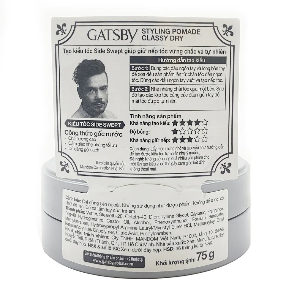 - Wax Vuốt Tóc Gatsby Pomade Classy Dry 75g có khả năng giữ nếp tự nhiên và tạo độ bóng cho tóc.