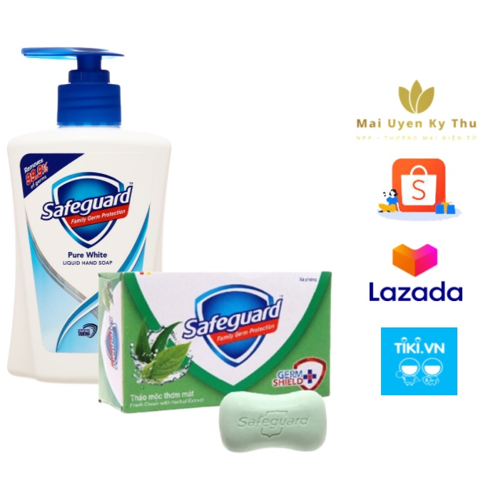 Đóng gói: 1 chai nước rửa tay trắng 450ml Safeguard và 1 xà bông cục 130g Safeguard