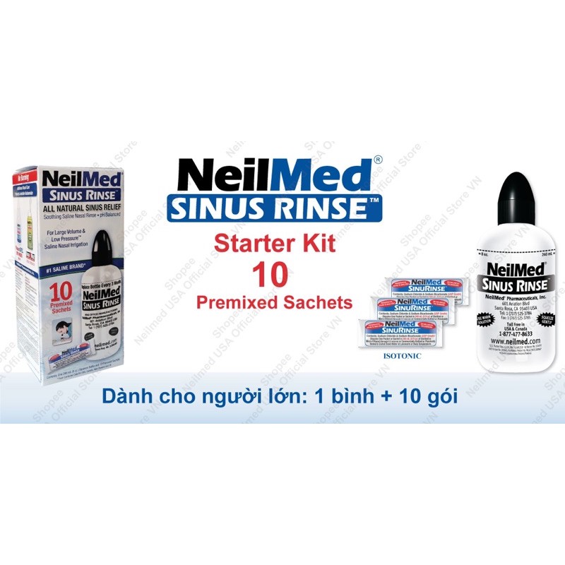 Giới thiệu Bộ Dụng Cụ (Bình) Rửa Mũi Xoang Người Lớn NeilMed Sinus Rinse Adult Kit (1 bình + 10 gói hỗn hợp muối rửa)