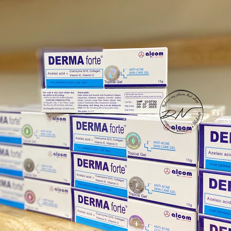 Derma Forte là gel bôi giảm m.ụn, mờ thâm, liền sẹo, dưỡng da có thành phần là Azelaic Acid(20%), Deionized, Vitamin C (Ascorbic Acid), Vitamin E (Tocopherol), Collagen, Curcum Longa Root Extract (tinh chất chiết xuất từ củ nghệ), Centella Asiatica Extract (tinh chất chiết xuất từ rau má), Coenzyme Q10, Squalane, Carbomer, Sodium Hydroxide, Glycolic Acid, Edta và Potassium Sorbate.