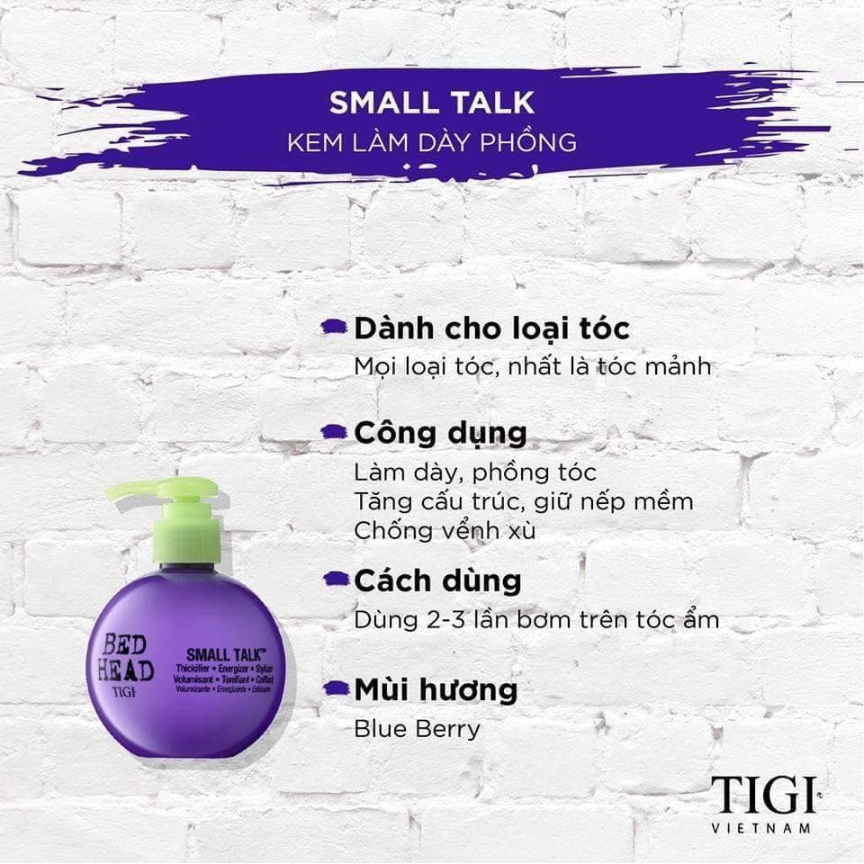 - Bed Head Tigi Small Talk là loại gel vuốt tóc đặc biệt không chứa cồn, vì thế không gây ngứa, không gàu, không bám bụi và bảo vệ tóc bạn khỏi tia cực tím có trong ánh nắng mặt trời.