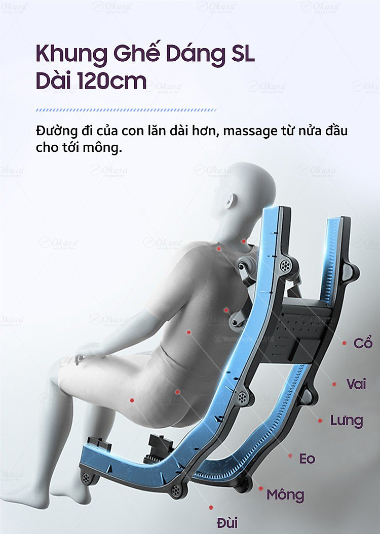 Cải tiến từ khung ghế dáng chữ L, khung ghế SL sẽ đưa con lăn đi sát cơ thể hơn, độ dài 120 cm khiến con lăn di chuyển từ nửa đầu cho tới mông, tăng hiệu quả massgae toàn thân.