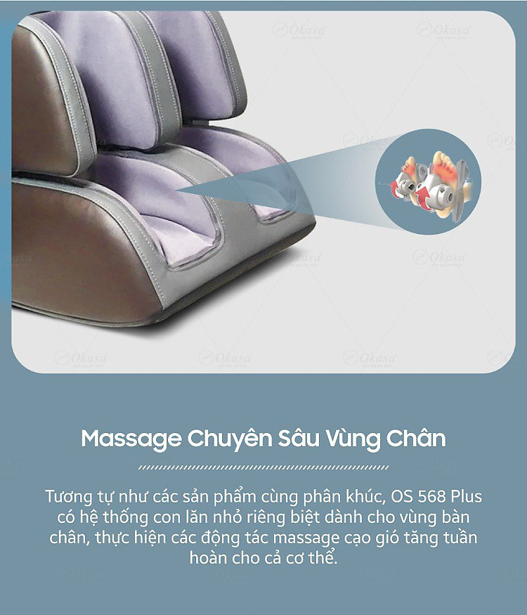 OS 568 Plus có hệ thống con lăn nhỏ dành riêng cho bàn chân, thực hiện động tác Massage cạo gió tăng khả năng tuần hoàn của cả cơ thể.