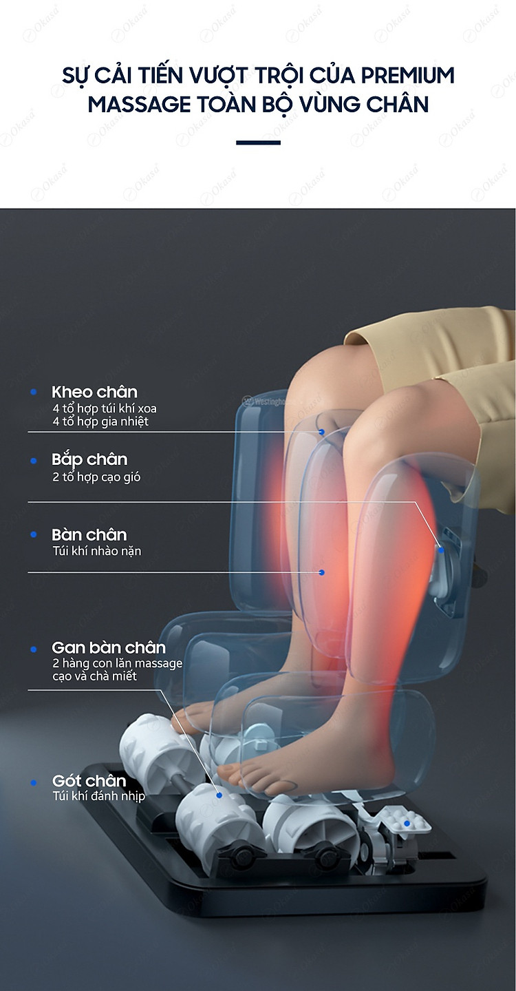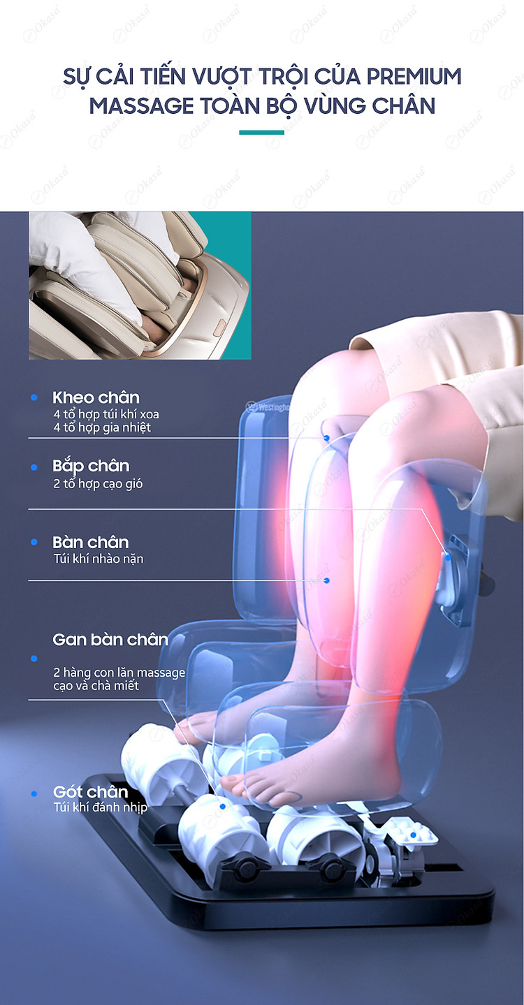Nếu như một số chiếc ghế Massage cao cấp khác có thể Massage cạo gió gan bàn chân, túi khí bắp châ Premium đã tinh tế hơn rất nhiều khi có khả năng Massage cho toàn bộ vùng chân: kheo chân, bắp chân, bàn chân, gan bàn chân và cả gót chân.