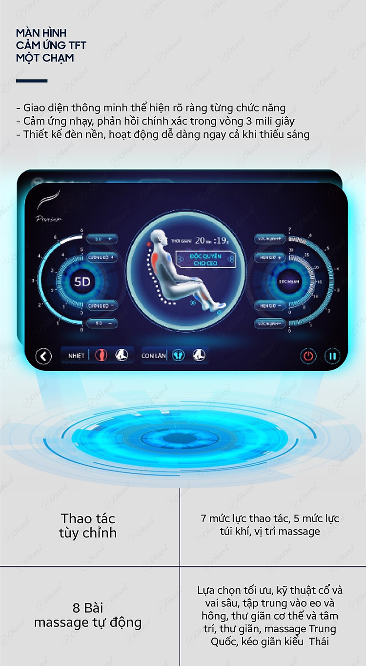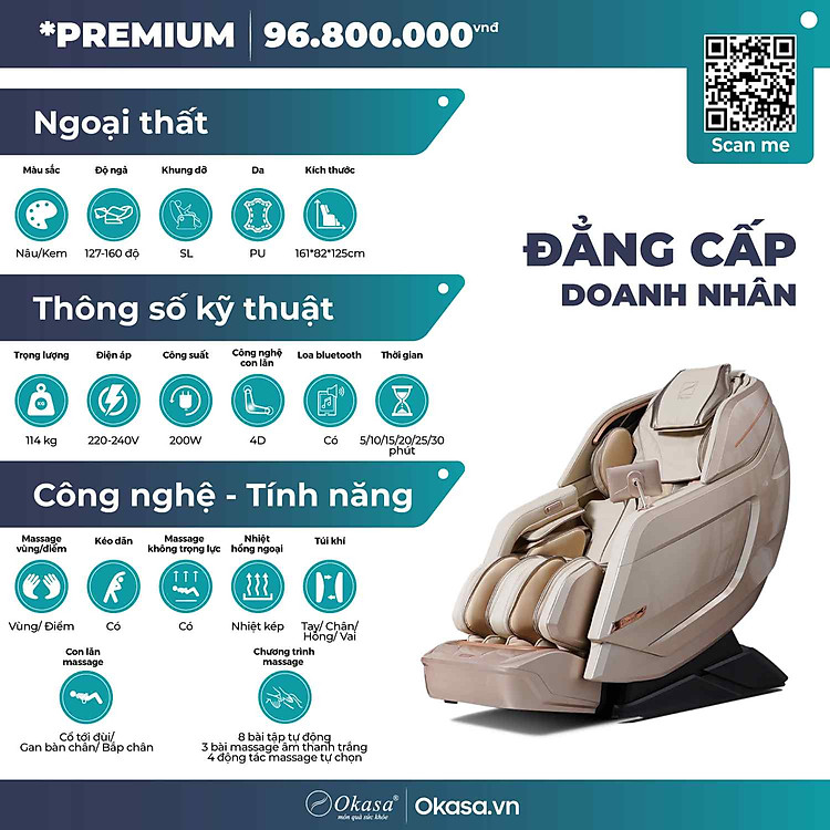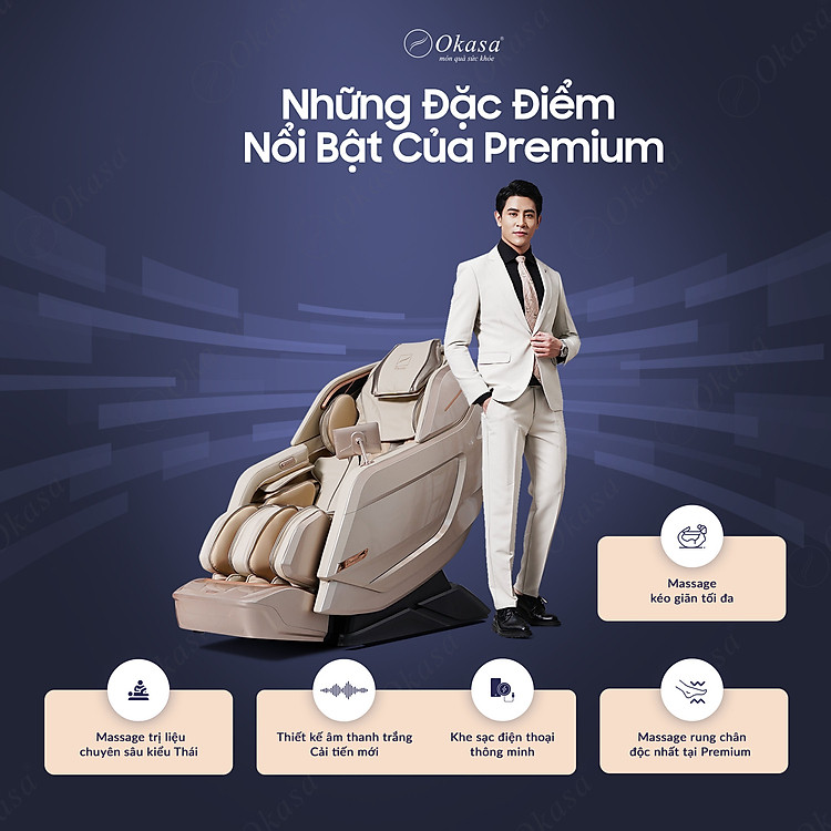 Okasa Premium là dòng sản phẩm mới ra mắt vào tháng 7/2021. Nếu bạn có thói quen Massage trị liệu, yêu thích hoạt động thể thao và cần tới một chiếc ghế Massage thật sự tác động tới những cơ bắp ẩn sâu nhất. Premium chính là sự lựa chọn hoàn hảo.