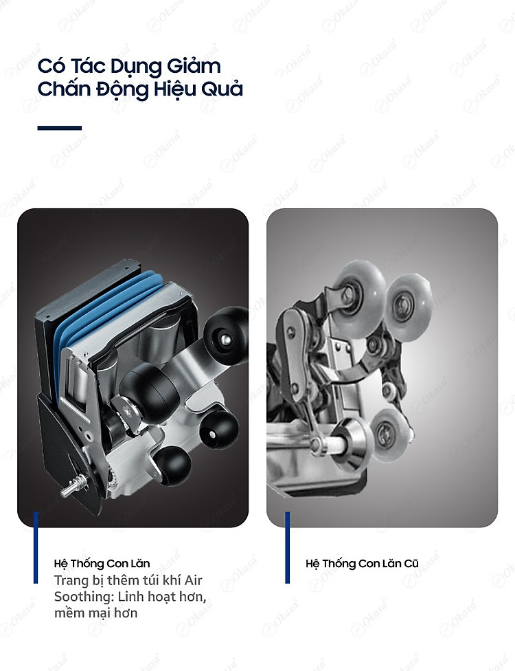 Con lăn của Premium được trang bị thêm túi khí kích thước nhỏ Air Soothing. Thay thế toàn bộ khung đỡ lò xo thông thường, con lăn của Premium sẽ giúp ra lực chính xác hơn, tiếp xúc nhẹ nhàng với cơ bắp mà không quá đột ngột, gây đau với người cao tuổi hay người thể trạng yếu.