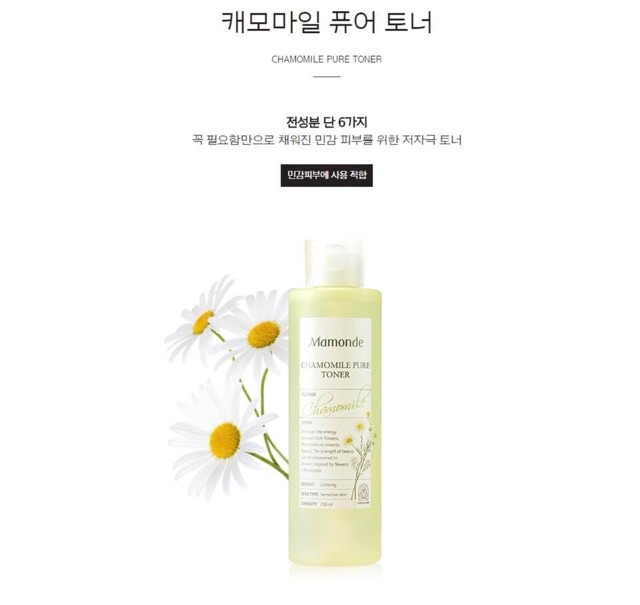 4. Chamomile pure toner Chamomile cho da nhạy cảm. Thành phần cực kỳ lành tính đc chiết xuất từ hoa cúc giúp cân bằng độ pH cho da làm dịu da mát da (hợp bạn nào đi nắng về mặt cứ phừng phừng, dùng như xịt khoáng cũng đc) tăng cường độ ẩm và giúp da hấp thụ tốt dưỡng chất ở các bước sau.