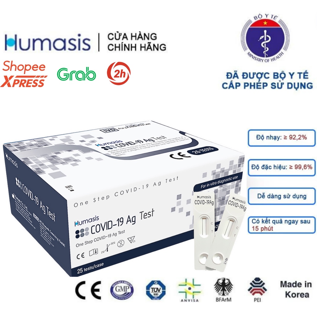 Humasis Covid-19 Ag Test do hãng Humasis Co. (Hàn Quốc) sản xuất, là thiết bị xét nghiệm có hiệu quả nhanh chỉ trong vòng 15 phút. Đây là bộ phát hiện kháng nguyên COVID-19 được Bộ Y tế thông qua cho phép sử dụng rộng rãi.