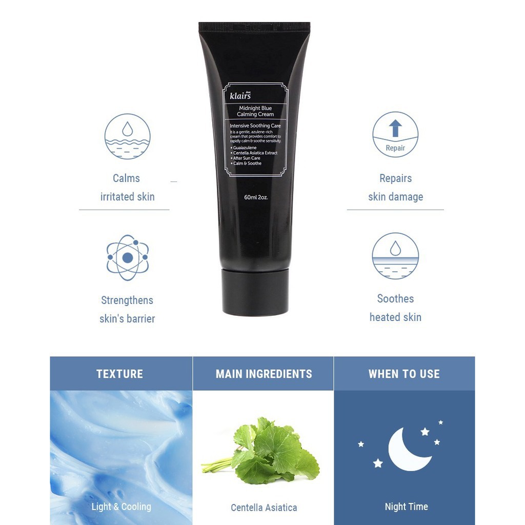 Giới thiệu Kem Cấp ẩm Chuyên Sâu, Làm Dịu Da, Phục Hồi Da Ban Đêm Dear, Klairs Midnight Blue Calming Cream 60ml
