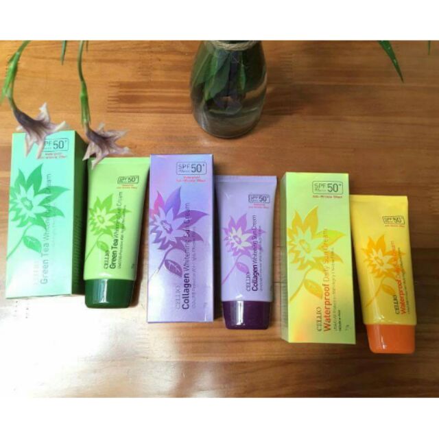 -Ngoài collagen,kem chống nắng cellio SPF 50PA+ còn chứa rất nhiều tinh chất thiên nhiên như: Olive, rosemary, lavendar, basil, soybean… cho làn da trắng tự nhiên và mịn màng.