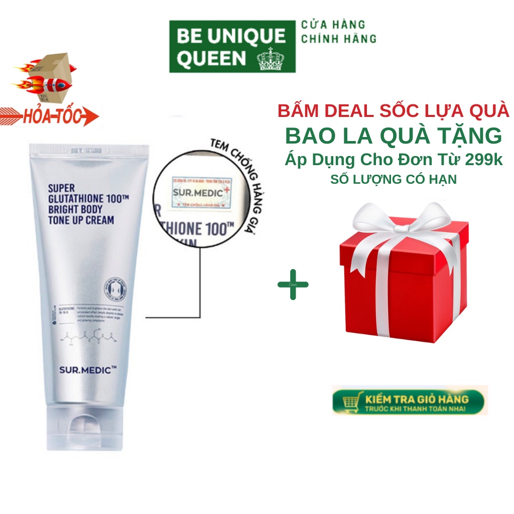 - Kem dưỡng Sur.Medic Super Glutathione 100 Bright BODY Tone Up Cream siêu đậm đặc với khả năng dưỡng trắng gấp đôi nhanh chóng giúp da trắng sáng, đều màu da.