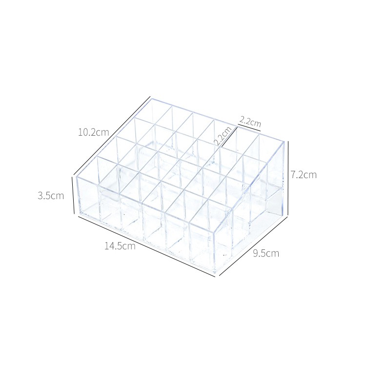 - Khay đựng son đa năng 24 ngăn được làm bằng mica đúc nguyên khối, trong suốt với thiết kế nhiều ngăn chứa sẽ giúp bạn bảo quản các các loại dụng cụ làm đẹp, mỹ phẩm hoặc các món đồ trang sức luôn được gọn gàng.
