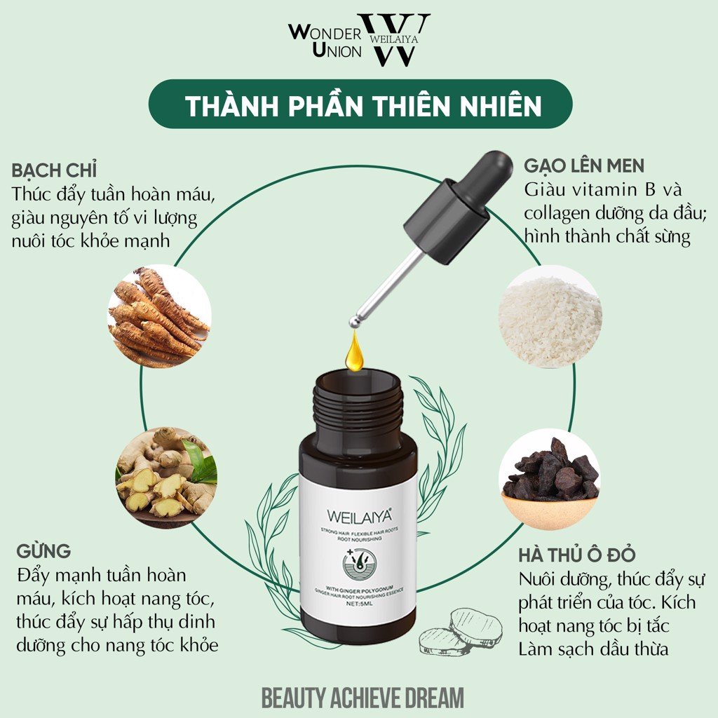 Serum kích mọc và làm dày tóc Weilaiya Ginger Hair Root Nourishing Essence chứa hơn 80% chiết xuất thiên nhiên cùng công thức dịu nhẹ, giàu thành phần hoạt tính giúp tinh chất thẩm thấu sâu vào từng nang tóc, mang lại hiệu quả vượt trội chỉ sau 12 tuần.