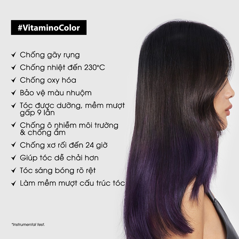 Xịt dưỡng đa năng chống nắng giữ màu tóc nhuộm 10 trong 1 Vitamino Color với hoạt chất Resveratrol chống oxy hóa, giữ bền màu tóc nhuộm với 10 công dụng tức thì: