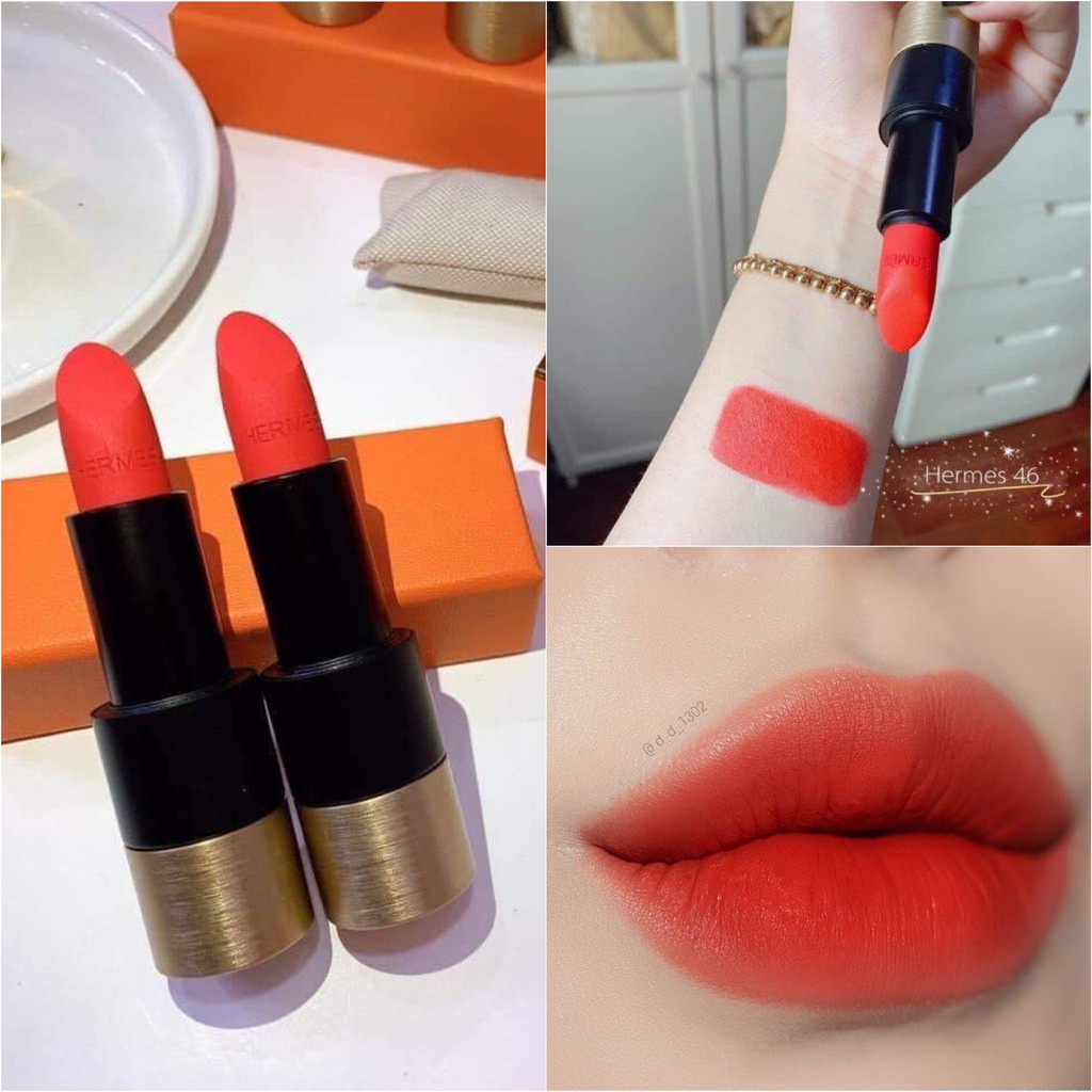 Son 46 Rouge Exotique là tông màu Hồng Cam tươi tắn, sẽ làm bừng sáng khuôn mặt của các Nàng. Khác với tông cam đỏ của son Hermes màu 53, thỏi 46 này màu hồng san hô nữ tính rạng rỡ.