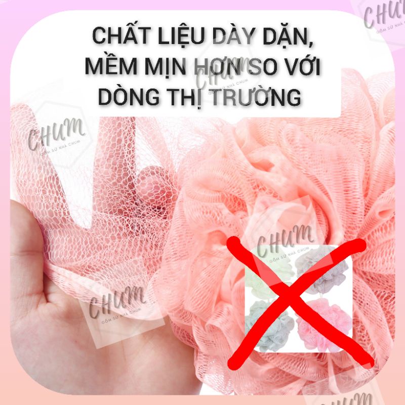 điểm khác của bông tắm nhà chum: dày nặng 45g. dòng dây lụa đen, bền, chắc chắn.