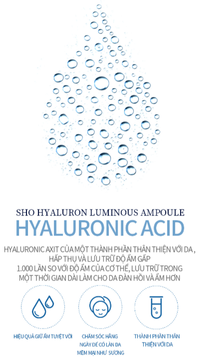 Hyaluronic Axit là một thành phần thân thiện với da,hấp thụ và lưu trữ độ ẩm gấp 1.000 lần so với độ ẩm của cơ thể, lưu trữ trong một thời gian dài làm cho da đàn hồi và ẩm hơn.