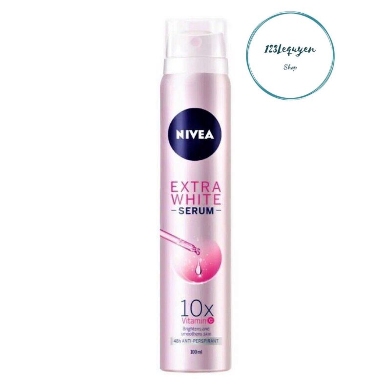 Xịt Khử Mùi Sáng Mịn Nivea Extra White Serum Spray Whitening Skin là dòng sản phẩm xịt khử mùi cho nữ chứa tinh chất Serum độc đáo từ thương hiệu mỹ phẩm NIVEA của Đức, không chỉ giúp giảm tiết mồ hôi và ngăn mùi hiệu quả tới 48 giờ mà còn dưỡng vùng da dưới cánh tay mịn, hỗ trợ se khít lỗ chân lông, giúp phái đẹp tự tin hơn khi diện mọi loại trang phục yêu thích.